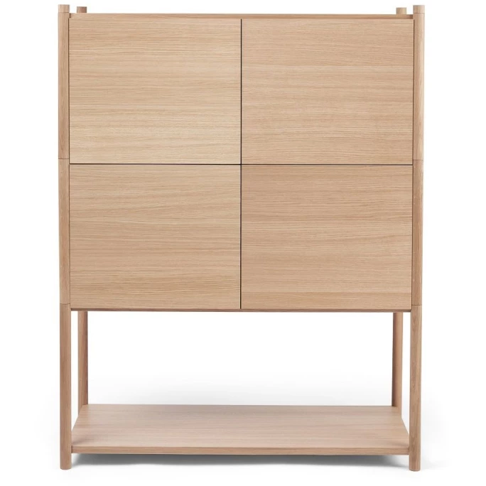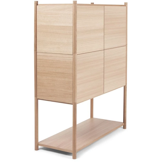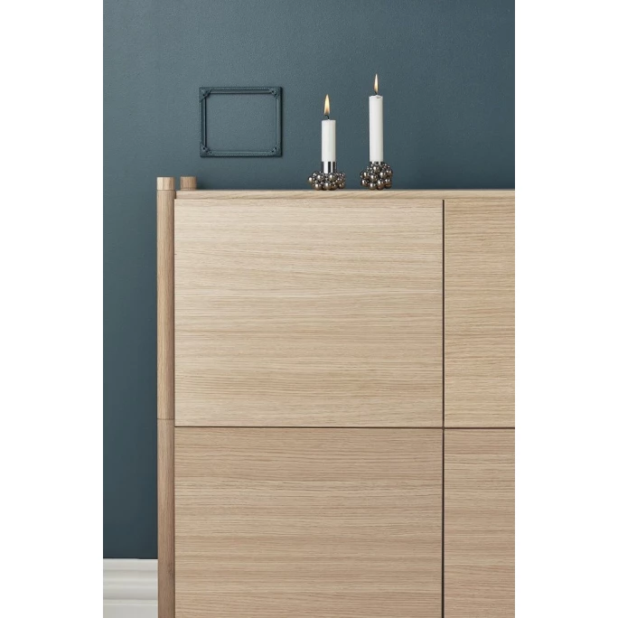 Perfekt für jedes Zuhause wird das Gejst Sceene Bücherregal E im minimalistischen Design nicht nur für Ordnung sorgen, sondern Sie auch begeistern. Das Sceene Bücherregal E ist ein modulares Regalsystem und besteht aus einem Modul 1, zwei Modulen 3, wovon die Module 3 zusätzlich mit einer Rück- und 2 Seitenwänden sowie 2 Türen verkleidet worden ist. So entsteht ein erstklassiges Sideboard, mit 4 Türen und insgesamt 4 Regalböden. Hergestellt aus edlem, wundervoll gemasertem Eichenholz mit weichen, runden Beinen passt sich das Regal perfekt Ihrem Zuhause an, unabhängig von Stil und Geschmack. Getreu dem Motto, das wir uns ständig verändern und uns neuen Herausforderungen stellen, hat der Berliner Designer Michael Rem ein erweiterbares Regalsystem für Gejst designt, dass sich so Ihren Bedürfnissen anpasst. Die Idee hinter Sceene ist es, einen Rahmen für die Erzählungen zu schaffen, die sich im Laufe des Lebens entwickeln. Ihre Geschichten verdienen es, geteilt zu werden, und mit Sceene können Sie Ihre Geschichten genau so erzählen, wie Sie es möchten. Spielen Sie selbst mit den Modulen 1 bis 4 oder wählen Sie aus den vorhandenen Lösungen: Sceene Bücherregal A, B, C, D, E, F oder G aus. Ihren Ideen sind dabei keine Grenzen gesetzt. Gejst Design ist pures skandinavisches Design und wurde 2013 im dänischen Odense mit der Leidenschaft gegründet, attraktives, nachhaltiges und langlebiges Design zu schaffen, das die Zeit überdauert. Dabei konzentriert sich Gejst auf funktionales Design und die Verwendung hochwertiger Materialien. Das Team von Gejst arbeitet mit renovierten Designern zusammen, die bereits etliche Preise erhalten haben. Wenn Sie auf der Suche nach einem Regal sind, dass im schönsten Design erstrahlt, bestellen Sie sich das Gejst Sceene Bücherregal E bei uns im Ambiendo-Shop. Oder erweitern Sie Ihr bisheriges Gejst-Bücherregal um ein weiteres Element.