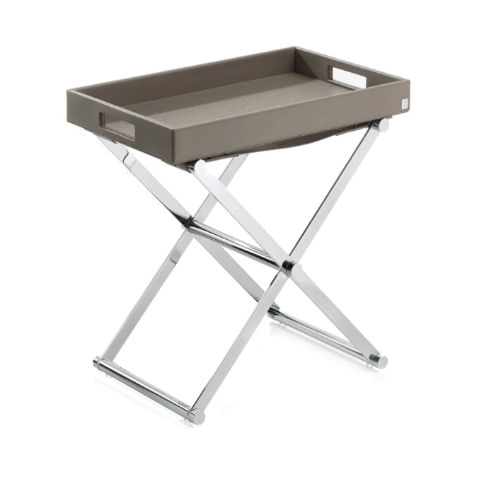 Egal ob im Wohn-, Arbeits-, Schlaf- oder Badezimmer: Mit dem praktischen Beistelltisch L aus der HOMELINE Kollektion von JOOP! haben Sie immer das perfekte Möbelstück, wenn Sie zusätzliche Ablagefläche benötigen. Das robuste, klappbare Untergestell besteht aus verchromten Metall und wird durch zwei Riemen in Lederoptik mit Logoprägung gesichert. Zudem befinden sich vier transparente Stellfüßchen auf der Unterseite des Gestells, die den Untergrund vor Kratern schützen. Das abnehmbare Tablett verfügt an den Schmalseiten über je eine Griff-Öffnung und lässt sich daher leicht anheben und transportieren. Die glatte Lederoptik und das silberne JOOP! Logo an der Längsseite, die Flechtprägung auf der Innenseite und die vier tonalen Stellfüße in Lederoptik auf der Unterseite runden das optische Gesamtbild des HOMELINE Tabletts perfekt ab. Ob Sie den JOOP! Beistelltisch L nun als solchen oder nur das Tablett benutzen und das zusammengeklappte Untergestell platzsparend in einer Ecke verstauen, es ist doch einfach gut zu wissen, dass der JOOP! HOMELINE Beistelltisch L so praktisch und dabei so elegant ist. Überzeugen Sie sich selbst!