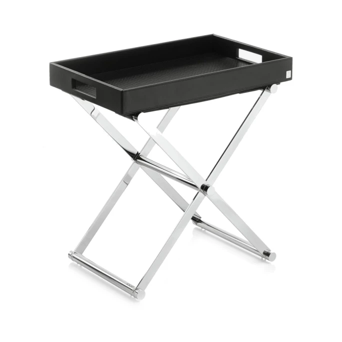 Egal ob im Wohn-, Arbeits-, Schlaf- oder Badezimmer: Mit dem praktischen Beistelltisch L aus der HOMELINE Kollektion von JOOP! haben Sie immer das perfekte Möbelstück, wenn Sie zusätzliche Ablagefläche benötigen. Das robuste, klappbare Untergestell besteht aus verchromten Metall und wird durch zwei Riemen in Lederoptik mit Logoprägung gesichert. Zudem befinden sich vier transparente Stellfüßchen auf der Unterseite des Gestells, die den Untergrund vor Kratern schützen. Das abnehmbare Tablett verfügt an den Schmalseiten über je eine Griff-Öffnung und lässt sich daher leicht anheben und transportieren. Die glatte Lederoptik und das silberne JOOP! Logo an der Längsseite, die Flechtprägung auf der Innenseite und die vier tonalen Stellfüße in Lederoptik auf der Unterseite runden das optische Gesamtbild des HOMELINE Tabletts perfekt ab. Ob Sie den JOOP! Beistelltisch L nun als solchen oder nur das Tablett benutzen und das zusammengeklappte Untergestell platzsparend in einer Ecke verstauen, es ist doch einfach gut zu wissen, dass der JOOP! HOMELINE Beistelltisch L so praktisch und dabei so elegant ist. Überzeugen Sie sich selbst!