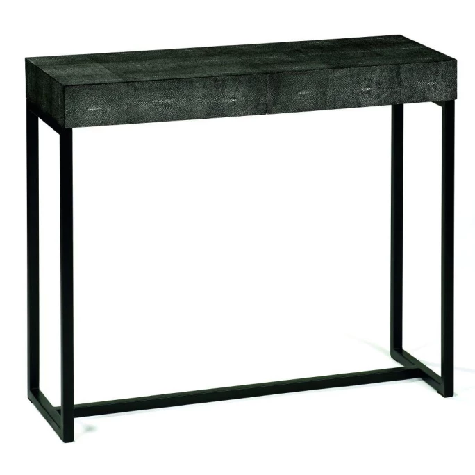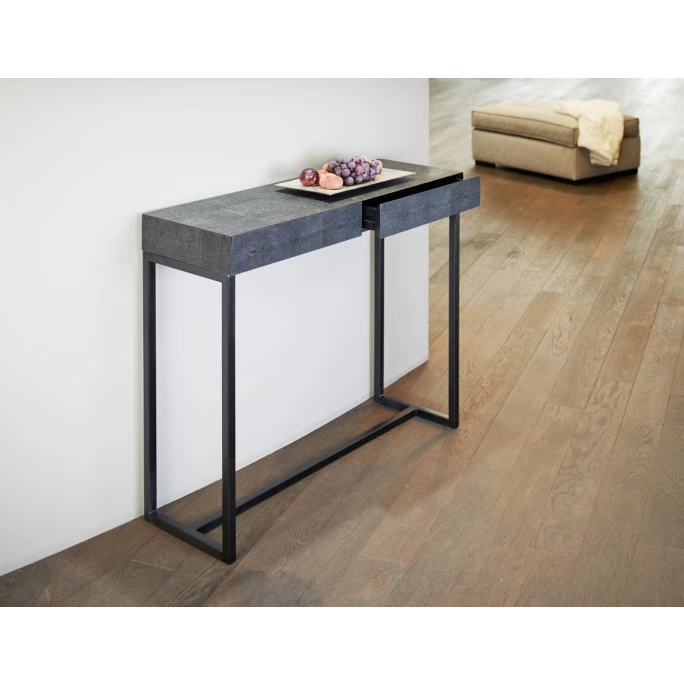 Mit der designstarken Konsole Mara von Lambert verleihen Sie jeden Raum Stil und Klasse. Das Konsolenoberteil wurde in Handarbeit mit Rochenhaut-Imitat belegt und besitzt zwei praktische Schubladen. Das geometrische Untergestell aus Eisen ist mit einer dunklen, matten Textur versehen. Originale Rochenhautmöbel aus dem Art-Déco-Stil erleben eine Renaissance und erzielen heute Höchstpreise in den großen Auktionshäusern in Paris und New York. Das Designteam von Lambert ließ sich von alten Entwürfen dieser Zeit inspirieren und so entstand Mara. Bitte reinigen Sie die Fläche nur mit einem weichen, nicht schleifenden Tuch, welches natürlich leicht angefeuchtet werden darf. Scharfe Reinigungsmittel und schleifende Gegenstände zerstören die Oberfläche. Entdecken Sie noch weitere wunderschöne Lambert Wohnaccessoires in unserem AMBIENDO-Shop – Sie werden von dem Design und der hochwertigen Qualität begeistert sein.
