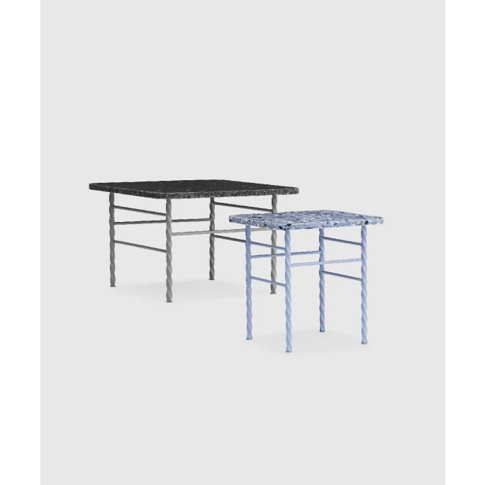 Der Designer Simon Legald hat in dem Tisch Terra von Normann Copenhagen das faszinierende Material Terrazzo verarbeitet – und einen Tisch mit unu?bersehbaren Referenzen an mediterrane Handwerkstraditionen und einem gleichzeitig nostalgischen und hypermodernen Look geschaffen. Die Inspiration zu Terra erhielt Simon Legald beim Besuch einer italienischen Terrazzofabrik. Er war sofort von dem ausdrucksstarken Material begeistert, das dort nach den urspru?nglichen italienischen Herstellungsvorschriften gefertigt wird. Granulierter Marmor wird mit Zement gemischt, in große Blo?cke gegossen und anschließend zugeschnitten. Jede Terrazzoplatte ist durch ihre ganz spezielle Mischung aus Steinfragmenten mit jeweils besonderen Formen und Farben etwas Einzigartiges. Terrazzo wird im Allgemeinen als Bodenbelag eingesetzt. Simon Legald verwendet den Werkstoff jedoch in einem neuen Kontext: als Tischplatte fu?r kleine Tische. Die Terrazzotischplatte von Terra hat abgerundete Kanten – ein optischer Bezug auf die spiralfo?rmigen Tischbeine. Die Beine sind in der gleichen Farbe wie die Tischplatte gehalten, was die beiden Elemente aufs Feinste miteinander verbindet. Simon Legald hat mit den Proportionen zwischen der soliden Tischplatte und dem schmalen Gestell gespielt und so eine zugleich zierliche und rustikale Gesamtoptik geschaffen. Terra kann im Innen- und Außenbereich eingesetzt werden. Das Tischgestell ist verzinkt und die Terrazzoplatte mit einer wasserfesten Versiegelung versehen – der Tisch ha?lt also Wind und Wetter stand. Der Tisch ist in zwei Gro?ßen erha?ltlich: Die niedrigere Ausfertigung eignet sich als Couchtisch, die ho?here Ausfertigung mit kleinerer Tischplatte ist als Beistelltisch oder Pflanzentisch ideal. Beide Gro?ßen lassen sich auch sehr gut miteinander kombinieren. Probieren Sie es aus und bestellen Sie den wunderschönen Tisch Terra von Normann Copenhagen!