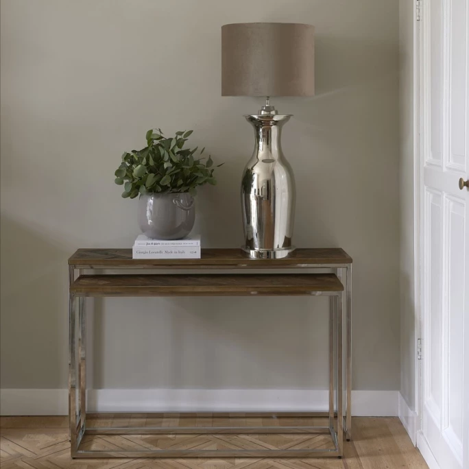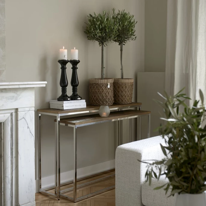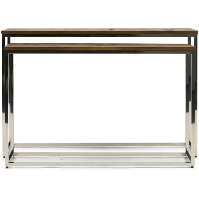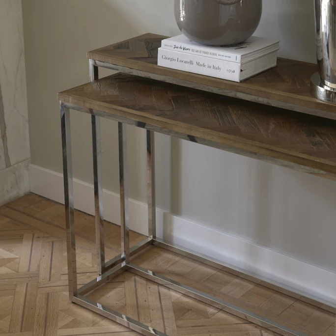 Elegant und platzsparend: Die tollen Bushwick Beistelltische von Rivièra Maison werden als praktisches 2er-Set zu Ihnen geliefert. Aus glänzendem Edelstahl und recyceltem Ulmenholz gefertigt, lassen sich die Bushwick Beistelltische bei Nichtgebrauch platzsparend ineinanderschieben. Das schicke Fischgrätmuster und die wunderschöne Maserung des Holzes gibt den Rivièra Maison Konsolentischen nicht nur einen besonderen Look, sondern macht jeden handgefertigten Tisch auch zu einem echten Unikat. Lassen Sie sich von dem edlen Design begeistern und setzen mit dem Bushwick 2er Beistelltisch-Set von Rivièra Maison stilvolle Akzente in Ihrem Zuhause!