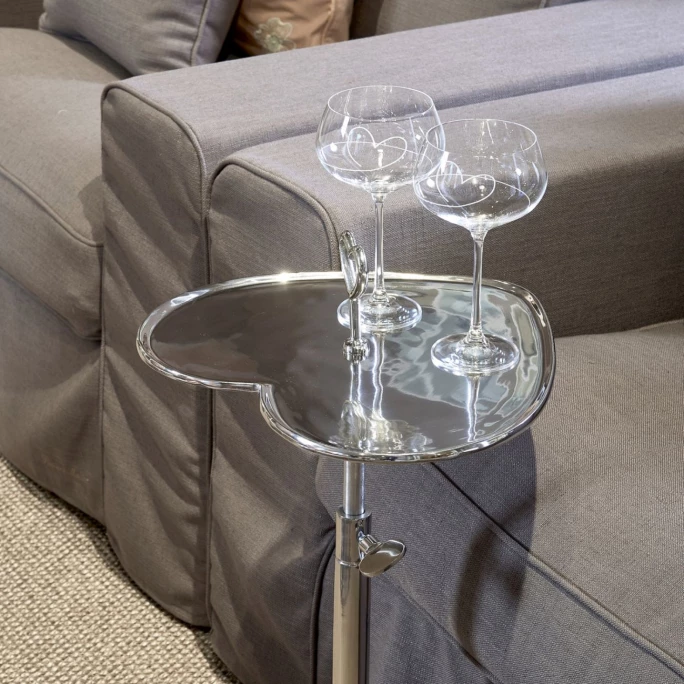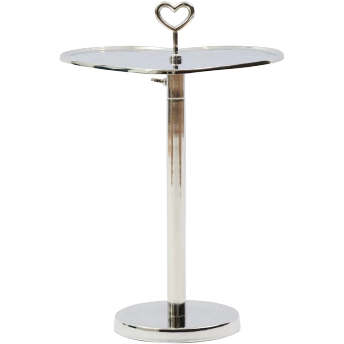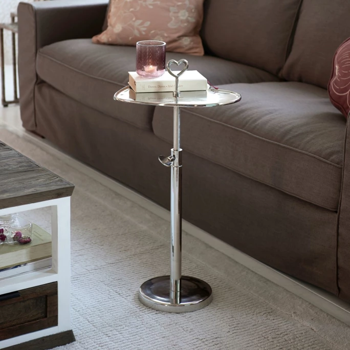 Nicht nur zur Hochzeit oder zum Valentinstag ein echter Hingucker! Aus glänzendem Aluminium gefertigt, begeistert der höhenverstellbare Lovely Heart Beistelltisch von Rivièra Maison durch eine herzförmige Tischplatte mit dezentem Rand. Der praktische Herzgriff auf der Platte ermöglicht Ihnen den robusten und standsicheren Tisch schnell und einfach anzuheben und zu verstellen – einfach genial! Dank der kleinen Flügelschraube kann der Rivièra Maison Beistelltisch zudem schnell und kinderleicht in der Höhe verstellt werden. Dadurch können Sie ihn jederzeit individuell an Ihre Bedürfnisse anpassen. Lassen Sie sich von dem tollen Design begeistern und holen sich mit dem Lovely Heart Beistelltisch von Rivièra Maison ein praktisches und wunderschönes Möbelstück in Ihr Zuhause.